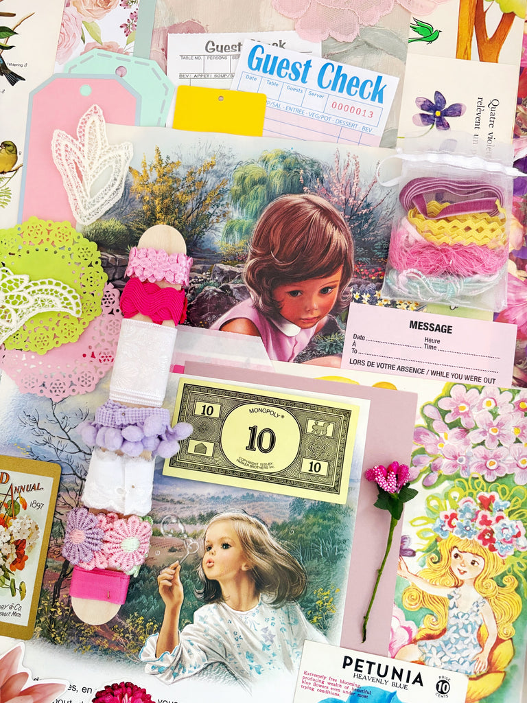 Inside, youâll find a beautiful mix of carefully selected vintage and modern papers, ephemera, and embellishments. Each piece chosen to help you create pages that feel personal, layered, and completely unique. With soft florals, pastel colors, and rich saturated vintage childrenâs illustrations.Â