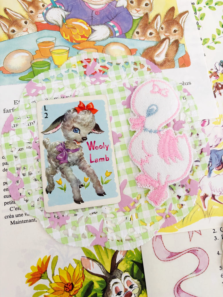 - 15 embellishments (including vintage fuzzy bunny appliqué)